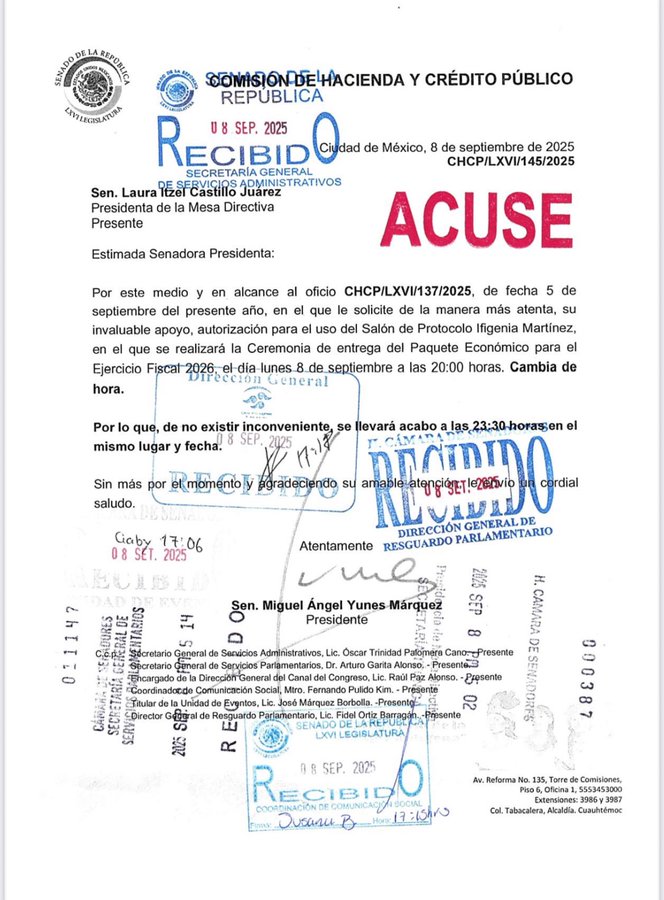 A las 17:15 la Comisión de Hacienda avisó a la Mesa Directiva del @senadomexicano que la entrega del paquete económico por parte de @Hacienda_Mexico será hasta las 23:30 horas.