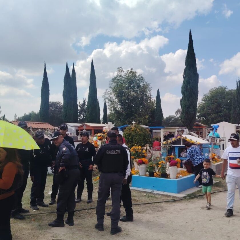 Los recorridos de vigilancia permanentes se realizaron en 26 unidades vehiculares y pie a tierra en las inmediaciones de los camposantos, incluyendo los principales panteones de San Nicolás Ozumbilla, San Martín Azcatepec y San Jerónimo.
