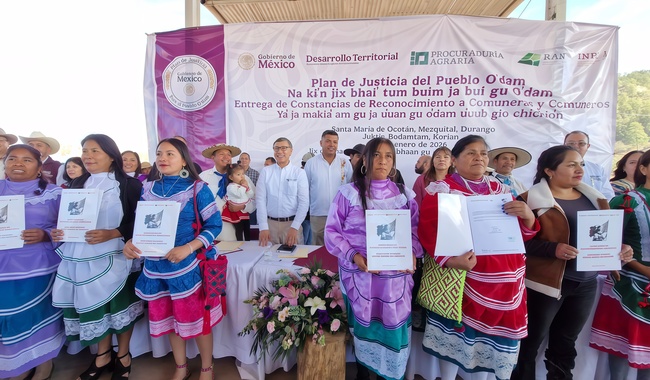 Un hecho sin precedentes y de justicia fue la entrega de constancias de reconocimiento de derechos agrarios plenos a personas comuneras del pueblo O’dam, El Mezquital, Durango, ya que, por primera vez las mujeres son mayoría en esta comunidad indígena con 6 mil 616 contra 6 mil 306 hombres de un total de 12 mil 922.