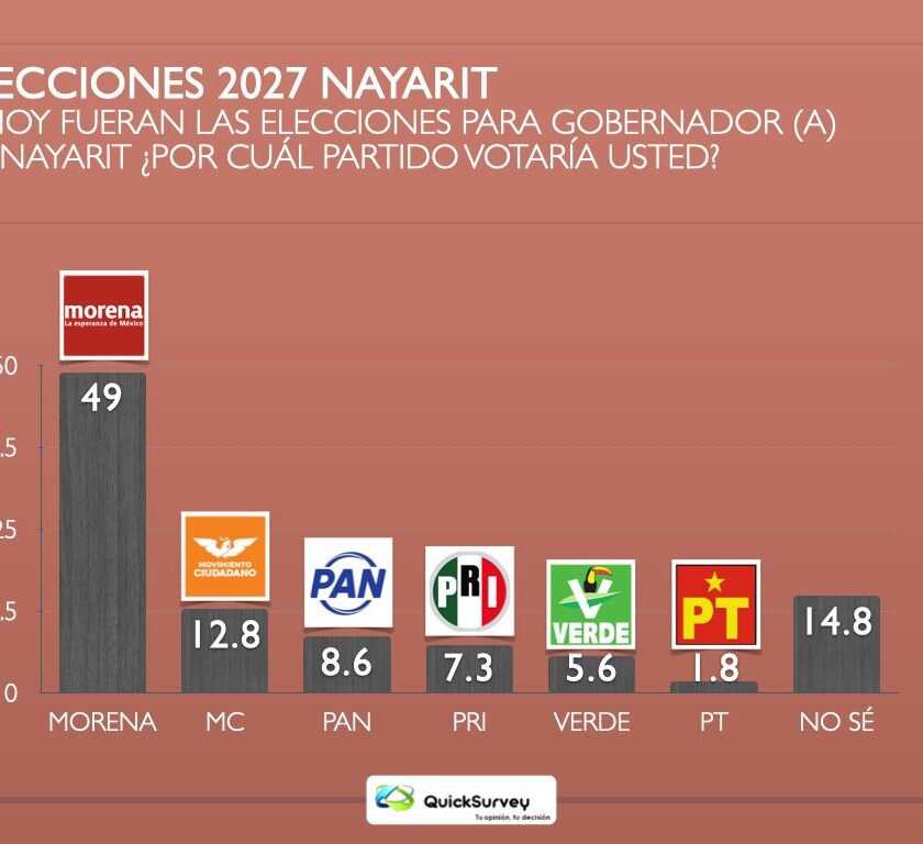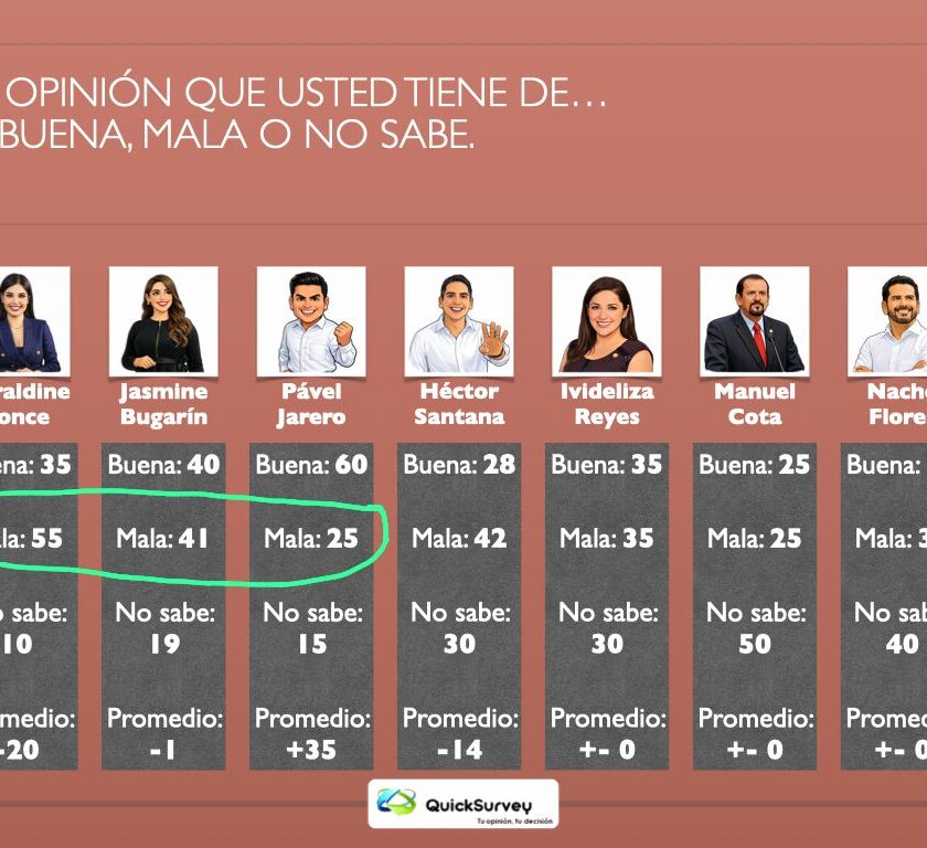En resumen tiene -20 cruzando opinión positiva con negativa y pierde para Morena puntos porcentuales.De acuerdo a una encuesta de “QUICK SURVEY – Tu Opinión, Tu Decisión”, realizada en enero para conocer la tendencia con rumbo a la elección de gobernador (a) 20 27, se establece que por Partido Morena mantendría una holgada ventaja en la contienda.A pregunta “si hoy fueran las elecciones para gobernadora, ¿Por cuál Partido votaría usted?”, Morena se sitúa con 49 por ciento de las preferencias; MC, 12.8; PAN, 8.6; PRI, 7.3; Verde, 5.6, PT 1.8 y 14.8 aún no sabe.