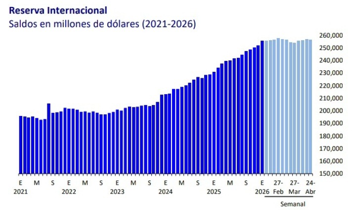 Al 24 de abril el saldo de la reserva internacional fue de 256,543 m.d., lo que significó una reducción semanal de 588 m.d. y un crecimiento acumulado, respecto al cierre de 2025, de 4,668 m.d.