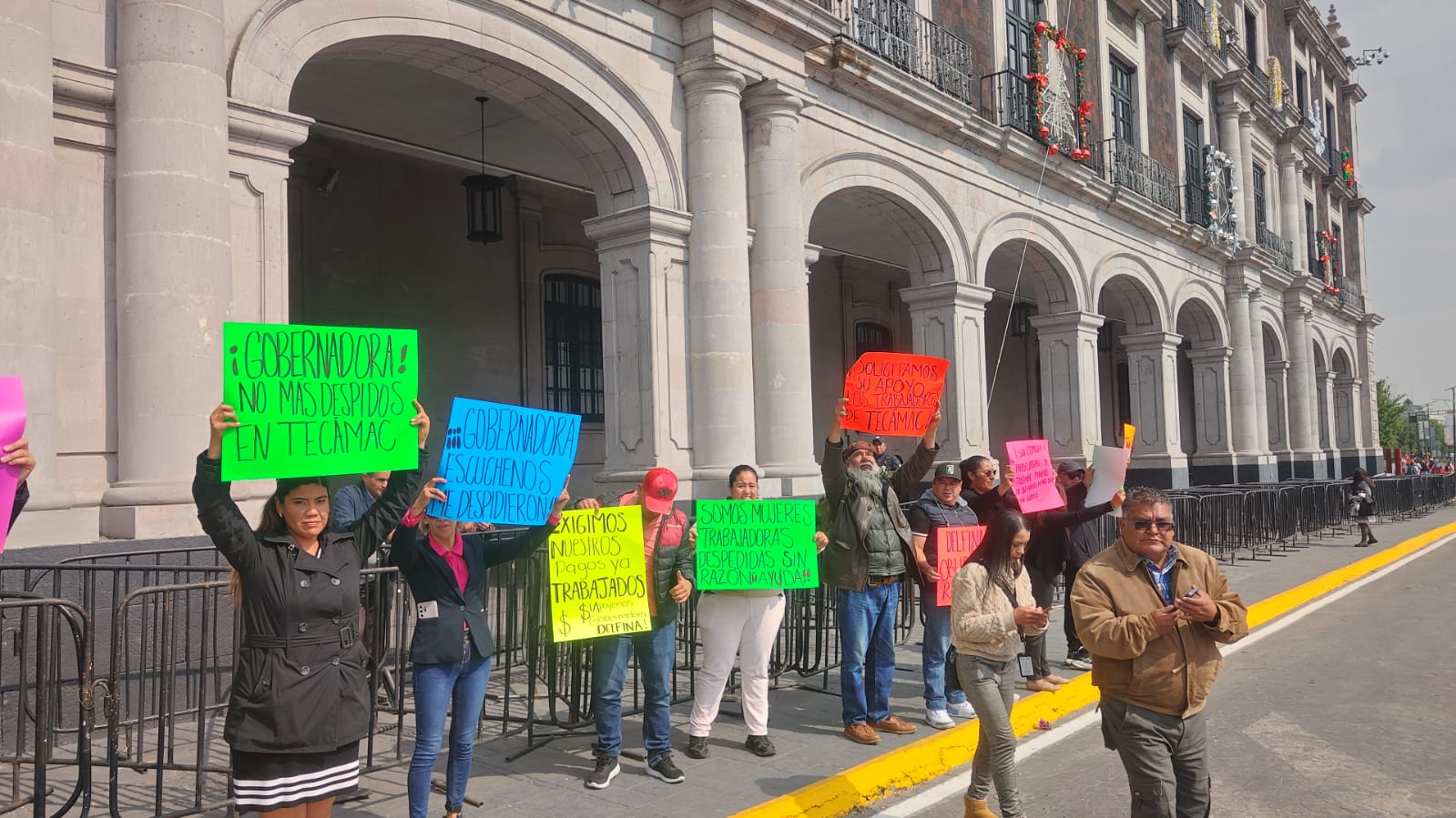Toluca, Edomex a 17 de diciembre del 2025. Trabajadores Despedidos de Tecámac Piden la Intervención de la Gobernadora Delfina *Acuden a Palacio de Gobierno a solicitar el apoyo de Delfina Gómez para que sean liquidados conforme a la ley *Señalan que la alcaldesa Rosi Wong Romero se niega a atenderlos; mantendrán su plantón en la explanada municipal (ESPECIAL) Una comisión…